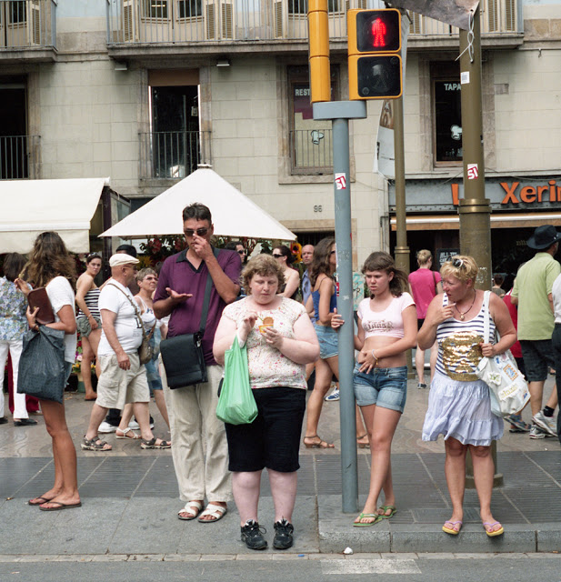 Então, encontrei uma faixa de pedestres lotada, um pouco além das ramblas, usei minha câmera para definir a exposição e o foco de onde eu iria ficar, e a entreguei para meu assistente. Comprei um sorvete e comecei a tomá-lo. Aprendi que eu conseguia reações melhores se estivesse “fazendo” alguma coisa.