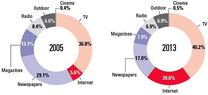 Seu estudo mais recente mostra que o poder destruidor — ou desruptivo, para usar um jargão — da Internet avança a passos rápidos sobre a fronteira que faltava: a televisão. A web tornou-se, no mundo, dona com folga do segundo lugar como mídia mais importante, terminando 2013 com 20,26% do dinheiro global de anúncios (2,7% vêm do mobile). A TV ficou com 40,2%, contra 17% dos jornais, 7,9% das revistas e 6,9% do rádio.
