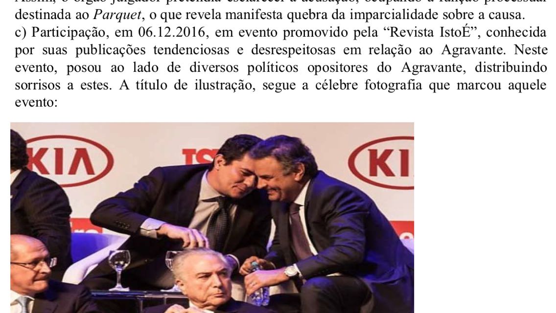 Em seu parecer com data dessa segunda-feira, 18, a representante do Ministério Público citou, entre outras coisas, a foto em que Moro aparece ao lado do senador Aécio Neves numa festa da Istoé.