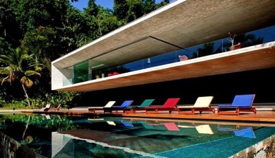 A mansão tem um andar quase subterrâneo e outros dois empilhados de forma engenhosa, parece que não se tocam. Fica na baía de Paraty, na costa do Rio.