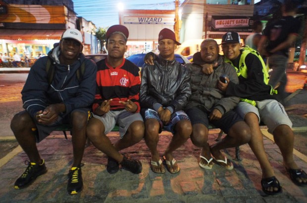 “Cebolinha Do Bonde”, 22 anos, reparou que as máquinas de refrigerante dão troco. “Aqui, você coloca o dinheiro e para pegar a lata você tem que—” ele faz mímica como se estivesse chacoalhando uma dessas máquinas. Mas o Brasil é mais liberal, pode-se beber na rua, ele conclui.
