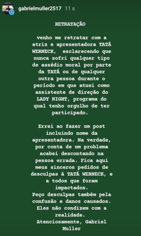 “Fica aqui meu sincero pedido de desculpas à Tatá Werneck e a todos os afetados. Peço desculpas também pela confusão e pelos danos causados, que não condizem com a realidade”, escreveu Muller em tom de retratação.
