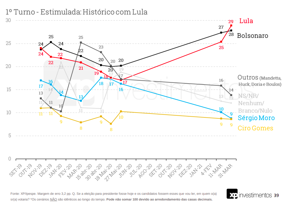 Na mais recente pesquisa XP/Ipespe, Lula aparece em empate técnico com Jair Bolsonaro, com um ponto à frente: 29% a 28%.