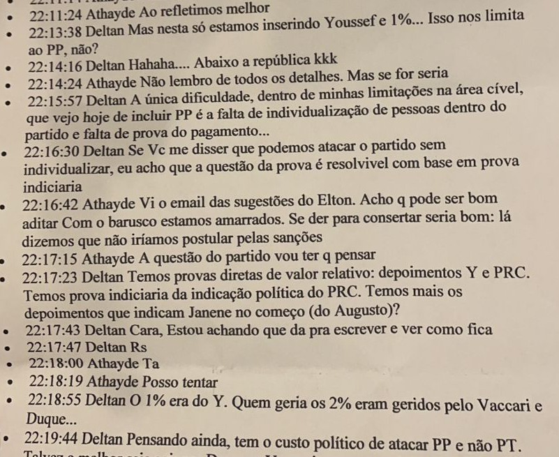 Em dado momento, Dallagnol observa que há “falta de prova do pagamento” de propina ao PP e a dupla passa a trabalhar com a hipótese de “provas diretas de valor relativo“, “prova indiciaria (sic)” e elementos de outras delações premiadas, como a de Alberto Yousseff (chamado apenas de “Y”) e a de Paulo Roberto Costa (identificado como “PRC”).