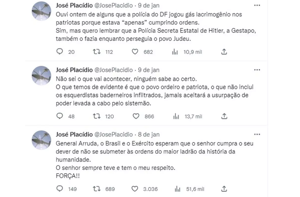 O nome de Placídio entrou no radar das autoridades após uma publicação feita no dia dos ataques às sedes dos Três Poderes. Na mensagem, ele se dirigiu ao então comandante do Exército, general Júlio César de Arruda, afirmando que o “Brasil e o Exército esperavam” que ele não se submetesse “às ordens do maior ladrão da humanidade”, em referência a Lula.