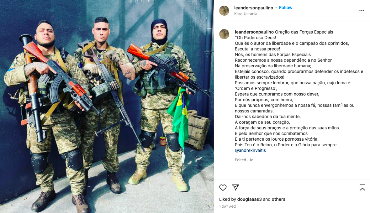 “É incrível como são descuidados e estúpidos os ‘voluntários’ brasileiros na legião estrangeira. Outro mercenário, capturado anteriormente perto de Lviv, também mantém discretamente um perfil aberto no Instagram, encantando regularmente os assinantes com novas histórias”, diz um internauta identificado como Spriter no Twitter.