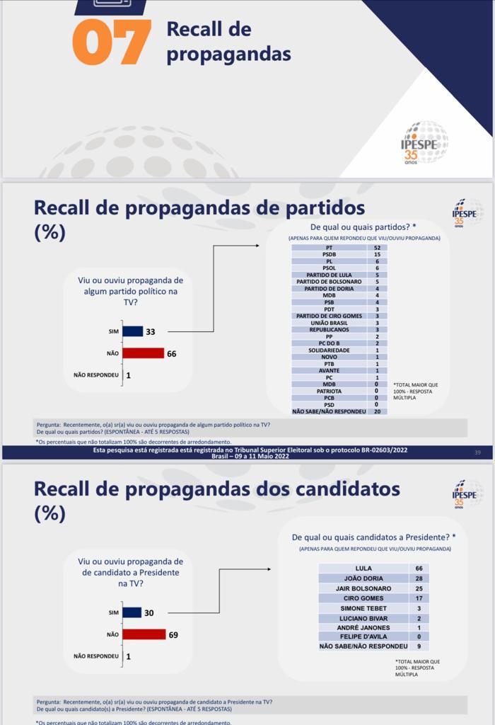Dos 33% de brasileiros que assistiram uma propaganda partidária na TV, 52% afirmam que assistiram a propaganda do PT. Outros 15% citaram a propaganda do PSDB. Os dois partidos seguintes que aparecem neste ranking são PL e PSOL (6% cada). Para quem afirmava, até aqui, que a comunicação do PT e da campanha de Lula era frágil, a pesquisa do IPESPE desmorona tal argumento e deve fazer lulistas céticos ou inseguros ficarem alegres com seu erro de interpretação.