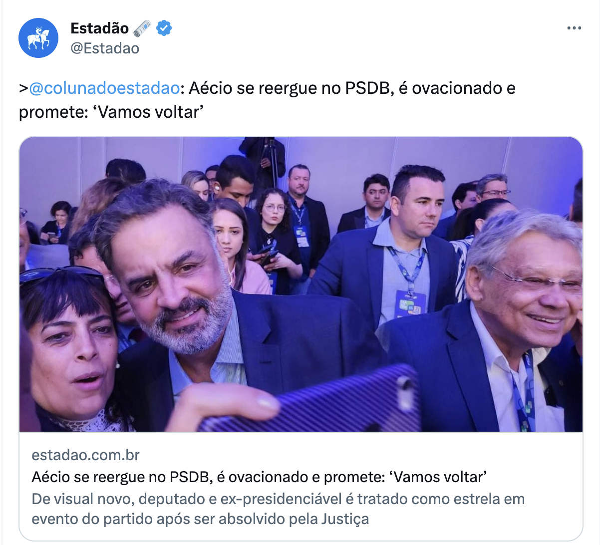 No Estadão, a coisa foi mais funda. “Aécio se reergue no PSDB, é ovacionado e promete: ‘Vamos voltar’”, dizia o título de uma matéria de quinta sobre o mesmo evento dos tucanos.