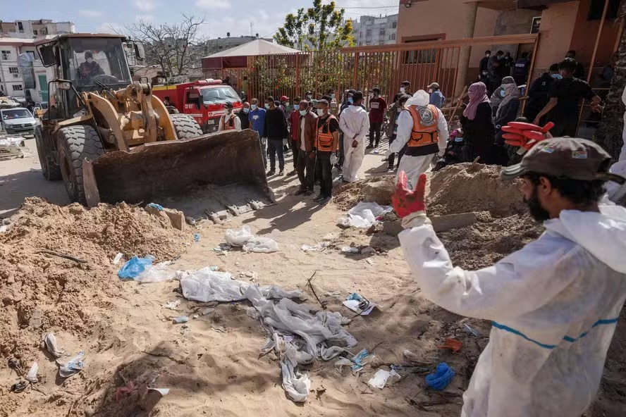 Em Khan Younis, funcionários da Defesa Civil encontraram uma vala comum no hospital Nasser, de onde quase 300 corpos foram exumados, encontrados após a retirada dos militares israelenses no último dia 7 do local.