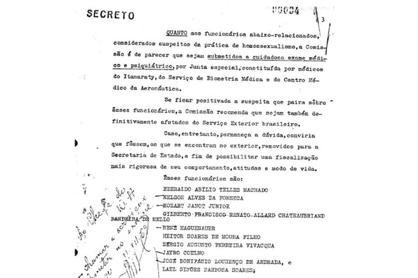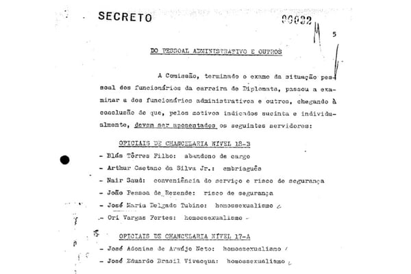 Além da homossexualidade, a comissão indicou outros motivos para expulsar profissionais do Ministério das Relações Exteriores, como “vício de embriaguez; vida irregular, instabilidade emocional, indisciplina funcional, insanidade mental, risco de segurança, uso de entorpecentes e motivos de saúde”.