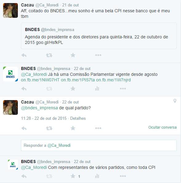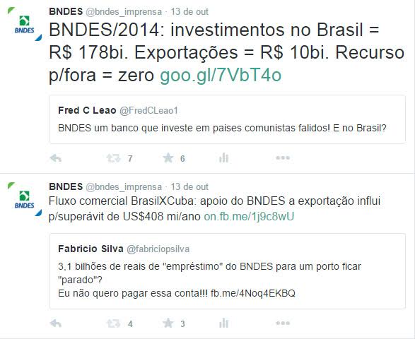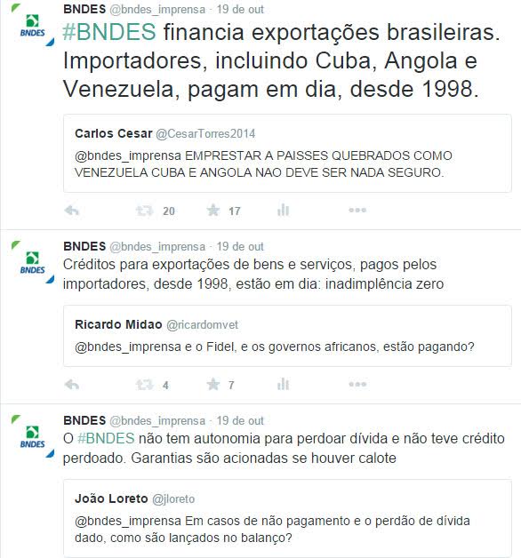 A equipe de assessoria de imprensa do BNDES está realizando um bom trabalho no sentido de responder as acusações mais estapafúrdias que aparecem nas redes sociais — esforço que deveria servir de modelo, aliás, mas é misteriosamente ignorado.