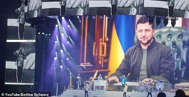 Antes de tocar isso na Quarterback Immobilien Arena, na cidade de Leipzig, no leste da Alemanha, na sexta-feira, ele exibiu a bandeira da Ucrânia junto com uma foto do presidente ucraniano em uma tela grande e fez uma saudação.