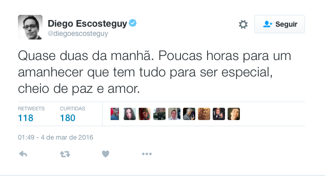 É o fascista que considera corriqueiro o editor da revista Época Diego Escosteguy tuitar, à 1h49 do dia da operação policial: “Quase duas da manhã. Poucas horas para um amanhecer que tem tudo para ser especial, cheio de paz e amor”.