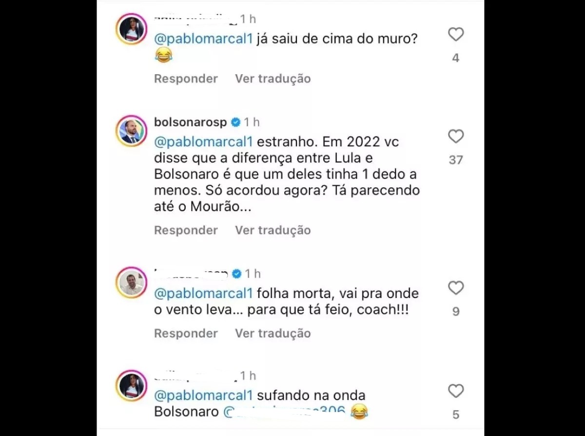 No mesmo post, bolsonaristas acusaram Marçal de tentar se aproximar dos eleitores do ex-presidente para a disputa pela Prefeitura de São Paulo. “Surfando na onda de Bolsonaro”, escreveu uma seguidora.