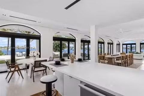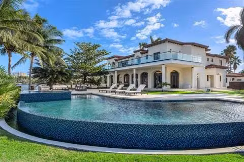 Essa mansão, localizada em um condomínio de luxo em Hollywood Lakes, tem seis suítes, um escritório, salas de estar e jantar integradas a uma cozinha com bancada, além de uma área de lazer que inclui piscina de borda infinita, bar aquático, banheira de hidromassagem, e uma quadra de tênis iluminada.