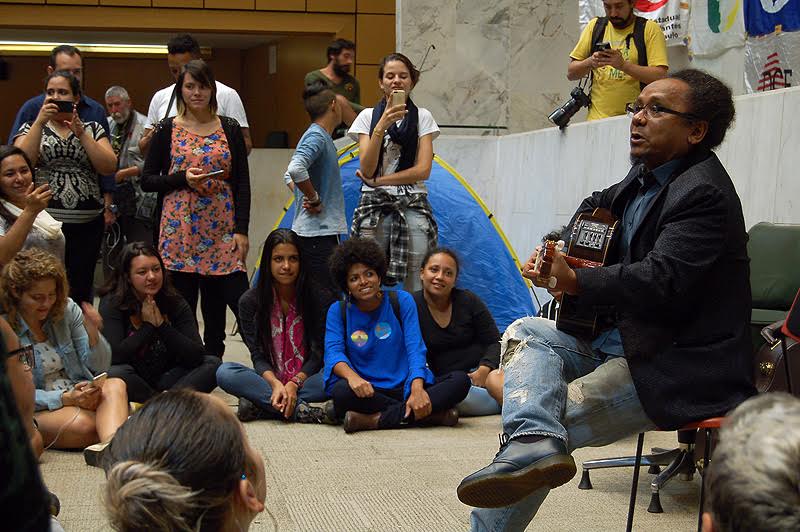 Já passava da meia-noite quando Chico César empunhou o violão e cantou no plenário da Assembleia Legislativa de São Paulo (ALESP). O cantor foi levar seu apoio aos estudantes que resolveram ocupar a ‘casa do povo’ no final da tarde de ontem e que ali prometem ficar até que seja aberta uma CPI para investigar desvios de dinheiro na máfia da merenda.