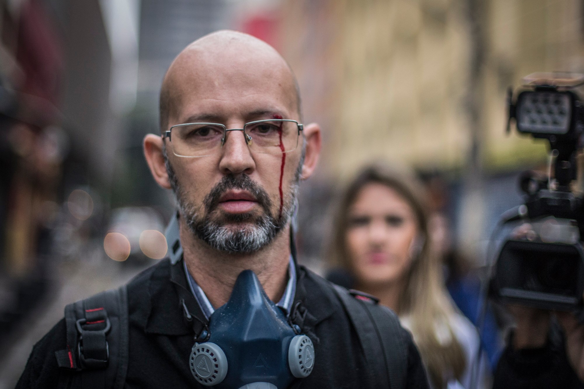 O primeiro golpe de cassetete veio em direção à minha cabeça e por sorte pegou de raspão. Além da pancada, apenas um corte próximo ao olho esquerdo. O segundo golpe foi direto na câmera.