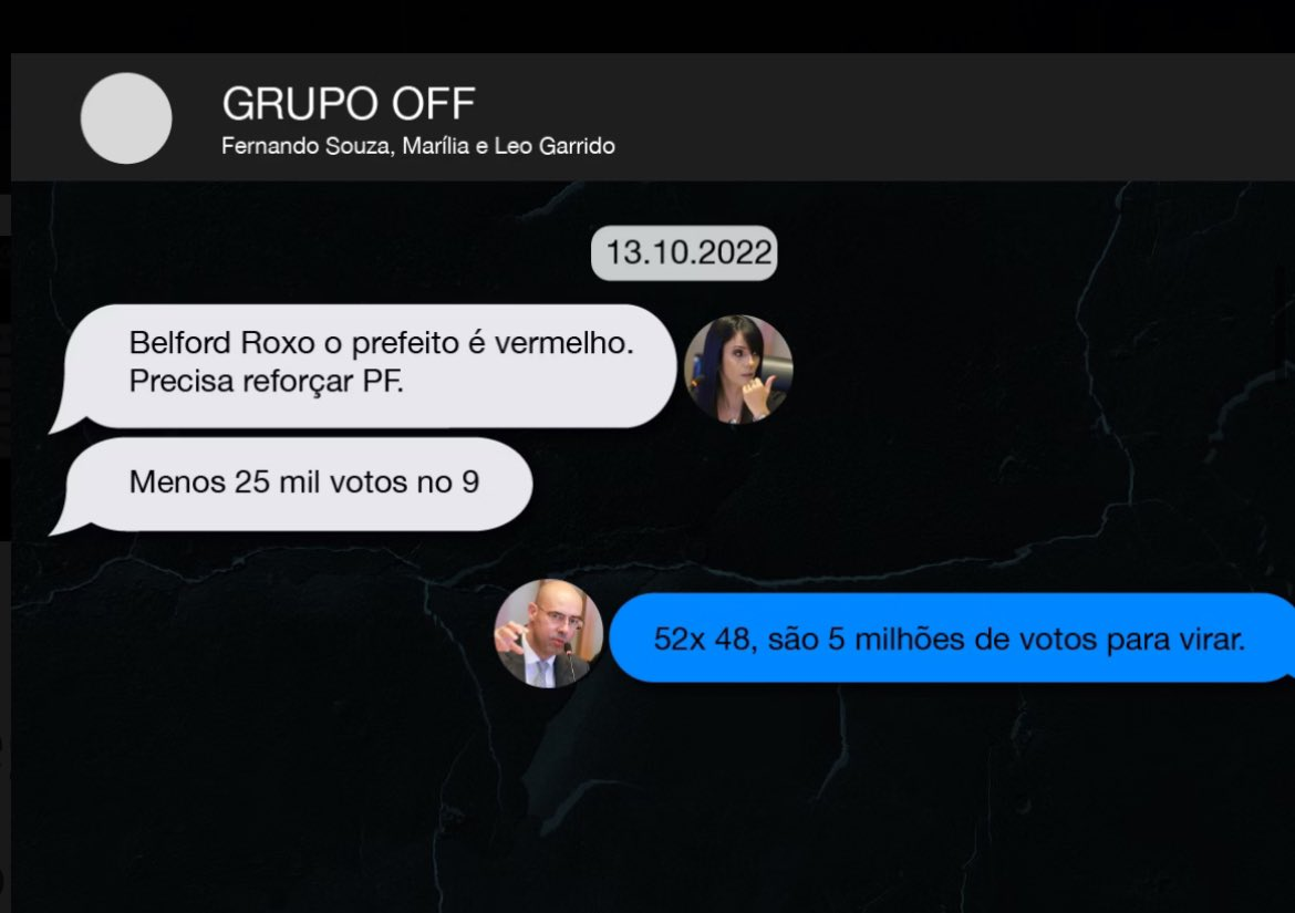 “[Em] Belford Roxo (RJ), o prefeito é vermelho. Precisa reforçar PF”, escreveu Marília. “Menos 25.000 votos no 9 [nine, como se referiam a Lula]”, acrescentou. Em outra mensagem, ela destacou: “Pelotas (RS) Pelotas foi 52×36 [%] pro Lula. 202 mil habitantes”. Fernando respondeu sugerindo o envio de equipes ao Rio Grande do Sul, estado com forte presença de eleitores petistas.