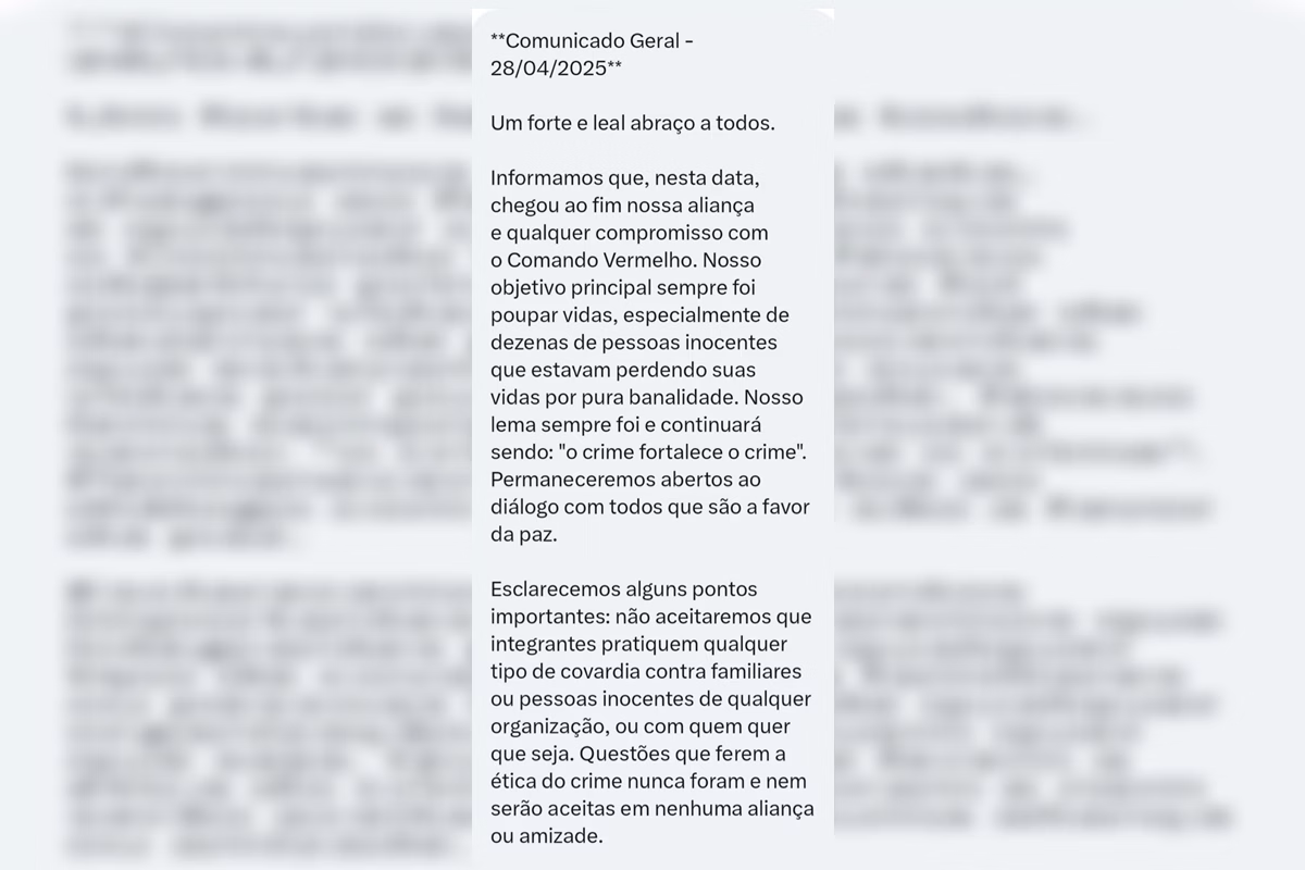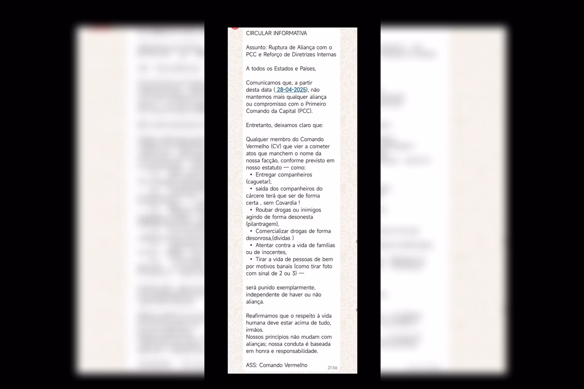 O CV, por sua vez, declarou que não mantém mais “qualquer aliança ou compromisso” com o PCC. O texto alerta ainda que o assassinato de inocentes segue proibido, citando mortes recentes de jovens que fizeram sinais atribuídos às facções com as mãos.