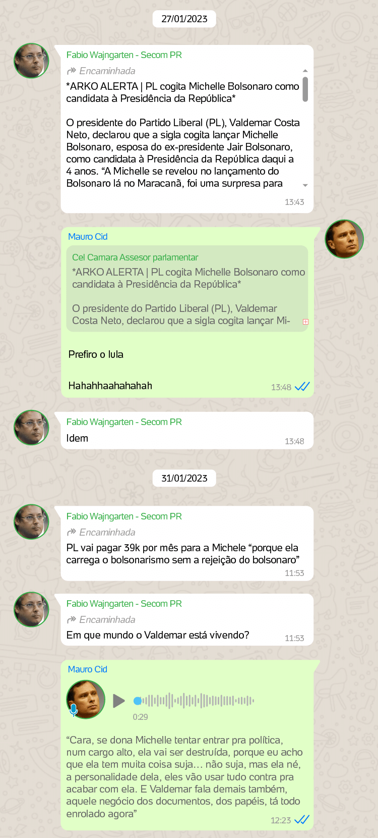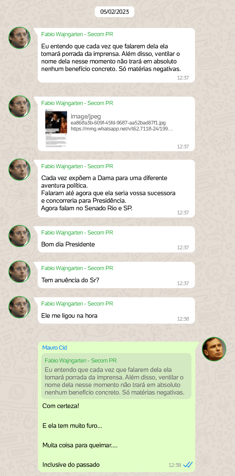 Em janeiro de 2023, Wajngarten enviou a Cid uma notícia sobre a possibilidade de o PL lançar Michelle como candidata à Presidência em 2026, caso Bolsonaro se tornasse inelegível. O militar respondeu de forma direta: “Prefiro o Lula”.