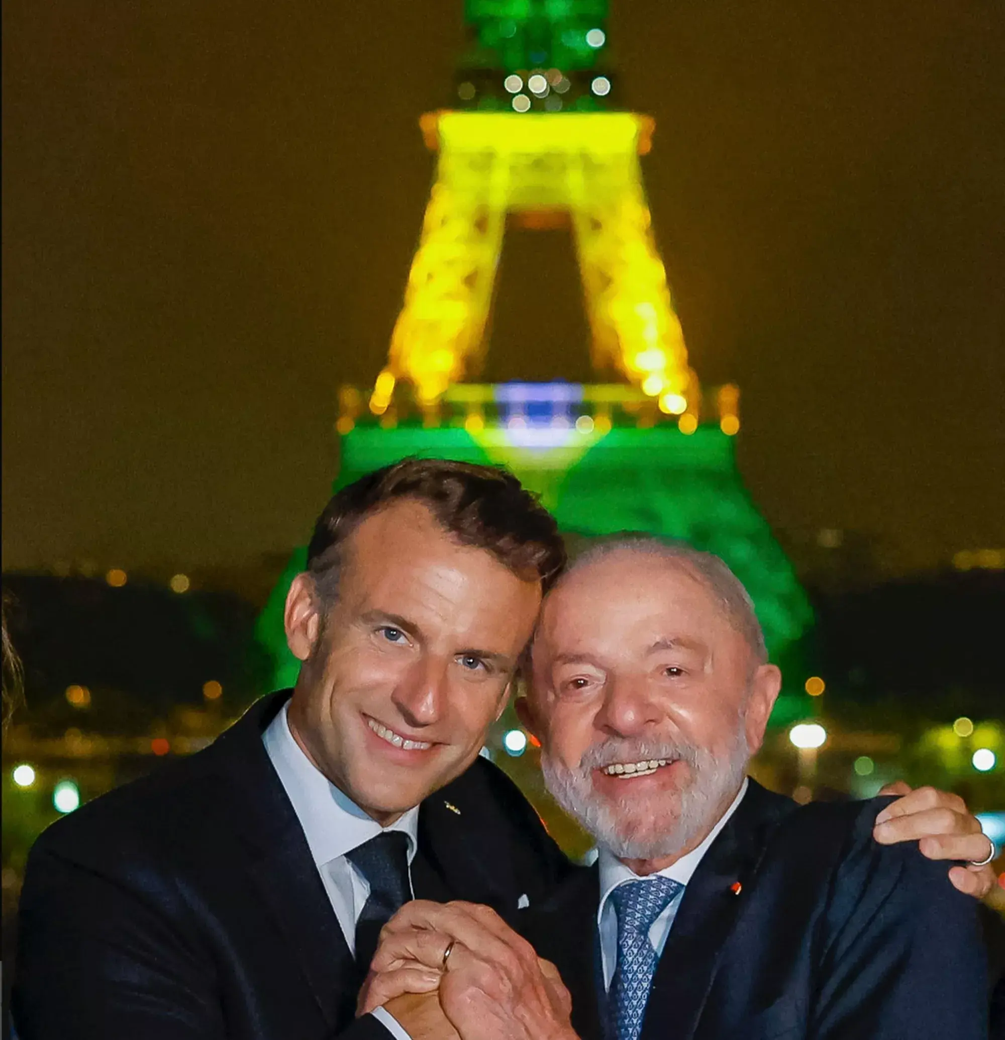 A Embaixada da França no Brasil publicou nesta quinta-feira (12) uma foto do presidente Luiz Inácio Lula da Silva (PT) ao lado do presidente francês Emmanuel Macron para marcar o Dia dos Namorados. O registro foi feito durante a visita oficial de Lula à França, no início de junho, e mostra os dois líderes de mãos dadas e rostos colados em frente à Torrei Eiffel, ponto turístico romântico de Paris.