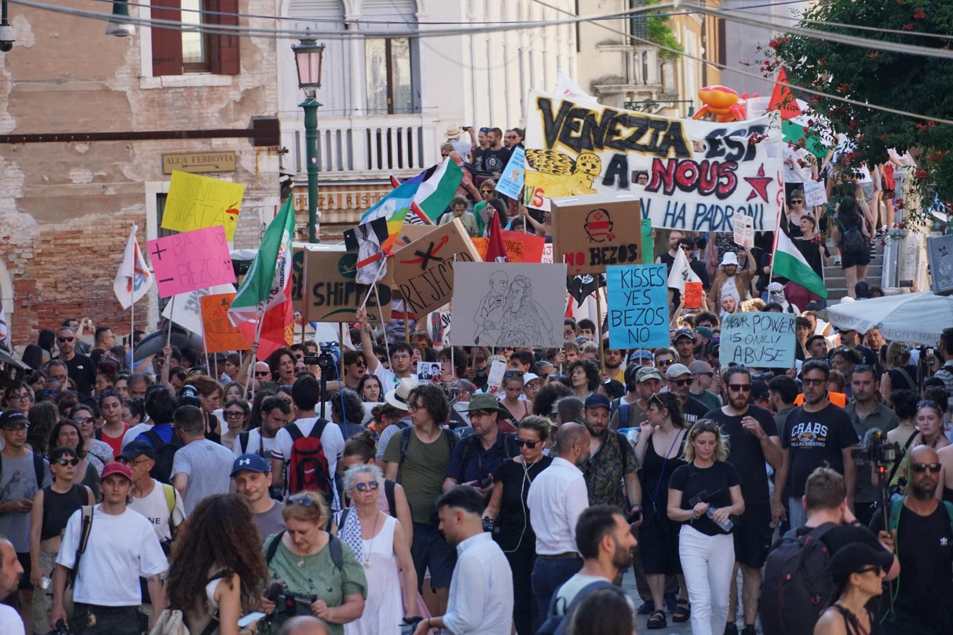 A cerimônia, que começou na quinta-feira (26) e atraiu celebridades como Kim Kardashian, Oprah Winfrey e Leonardo DiCaprio, foi marcada por tensões. Manifestantes do coletivo “No Space for Bezos” espalharam cartazes com notas falsas de dólar estampando o rosto do bilionário e ergueram faixas com os dizeres: “Sem espaço para Bezos”.