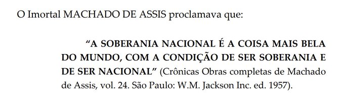 Na decisão de impor o uso de tornozeleira eletrônica ao ex-presidente Jair Bolsonaro (PL) nesta sexta-feira (18), o ministro Alexandre de Moraes, Supremo Tribunal Federal (STF), citou o escritor Machado de Assis para justificar a medida. “A soberania nacional é a coisa mais bela do mundo, com a condição de ser a soberania e ser nacional”, diz o autor na frase destaca por Moraes, retirada de suas “Crônicas – Obras completas”, publicadas em 1957.