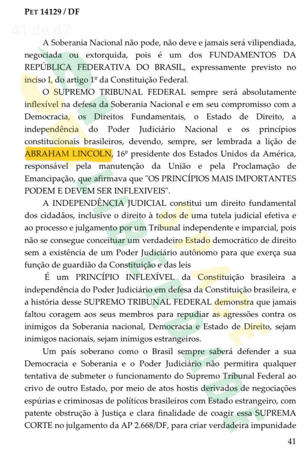Além do histórico escritor brasileiro, Moraes também fez menção a um dos mais consagrados presidentes dos Estados Unidos, Abraham Lincoln, em uma provocação a Trump. O magistrado citou que o 16° presidente estadunidense foi “responsável pela manutenção da União e pela proclamação da Emancipação” de sua nação.