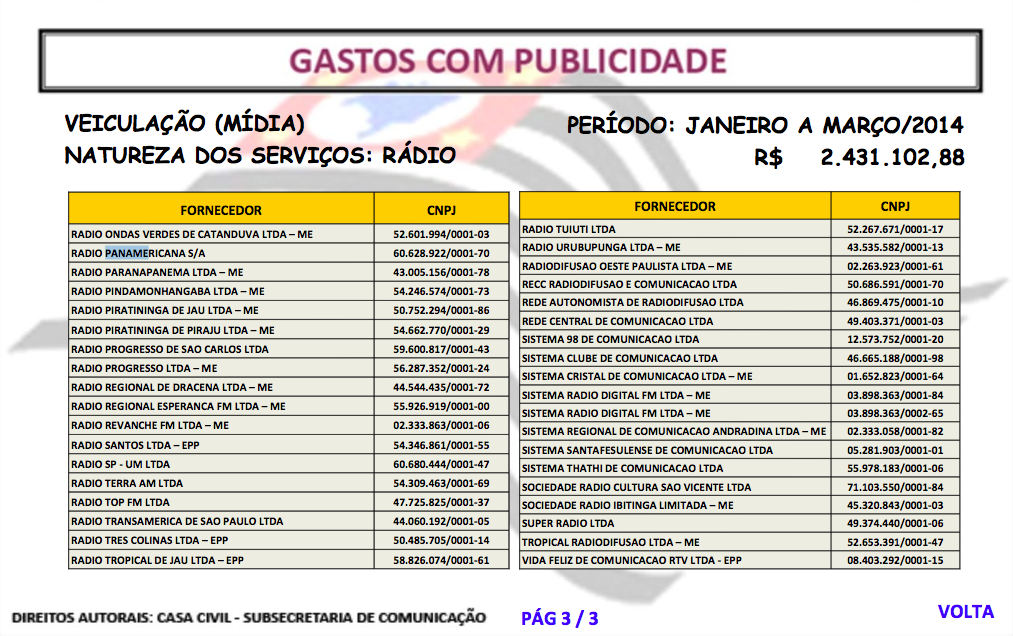 No primeiro trimestre de 2014, a Pan (identificada como Rádio Panamericana, como se vê no quadro abaixo) era a estrela de uma lista de emissoras que receberam R$ 2,4 milhões.