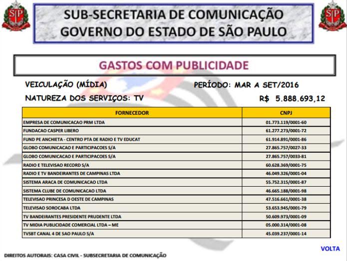 Nesse mesmo período, a TV Globo é listada como recebedora de R$ 5 888 693,12 milhões, juntamente com a TV Gazeta, SBT, Bandeirantes, Cultura e outras. Entre março e setembro, a editora Globo aparece como recebedora de R$ 384 076,69 com mais duas empresas.
