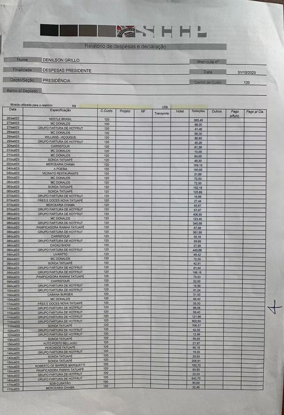 Relatório de despesas do Corinthians, obtido e verificado pelo portal ge, mostra que o clube repassou R$ 80 mil em espécie à presidência entre os dias 2 e 30 de outubro. O valor declarado nos comprovantes foi de R$ 86,5 mil, o que geraria um reembolso de R$ 6,5 mil a Duílio. Ao todo, foram 176 compras feitas no período.