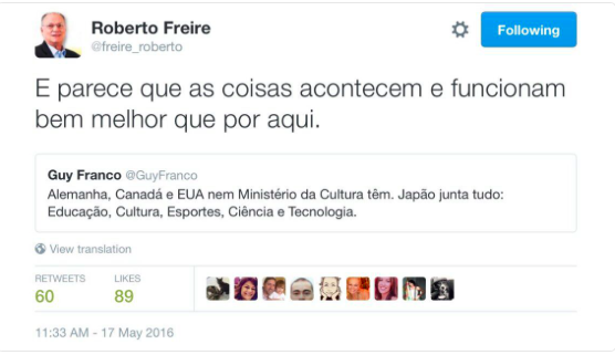 É o tipo de sujeito que não vê qualquer constrangimento em assumir uma pasta cuja extinção ele defendeu publicamente ao responder a um fã no Twitter (onde, aliás, dá lições diárias de indigência, mais ou menos como um Roger do Ultraje de banho tomado).