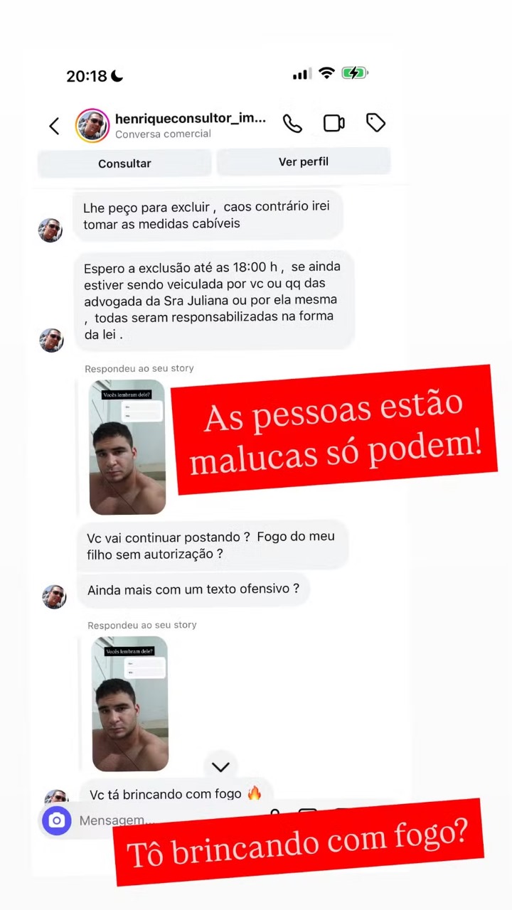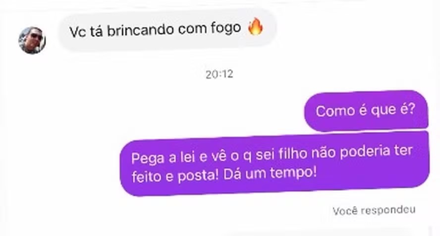 Em prints divulgados por Talita, o homem pediu que as postagens fossem removidas e disse que tomaria medidas legais caso as fotos continuassem publicadas. “Você vai continuar postando foto do meu filho sem autorização? Ainda mais com texto ofensivo? Você está brincando com fogo”, diz uma das mensagens atribuídas a Henrique Cabral, pai do acusado.