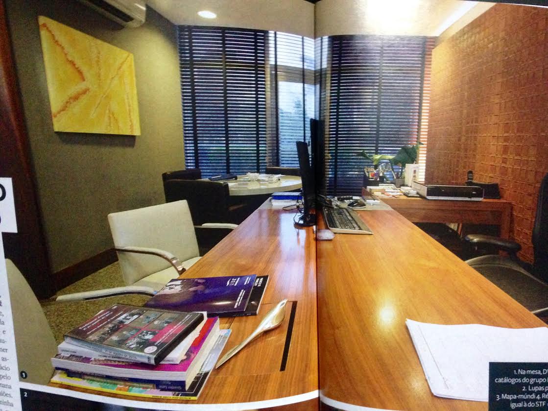“A decoração é sóbria, com mesas, estantes e portas de madeira, além de cadeiras e de sofás em tons claros. Na espaçosa sala de reunião, que conta com um janelão de vidro com vista para a rua, os convidados têm a disposição papel, canetas e até balas personalizadas”.