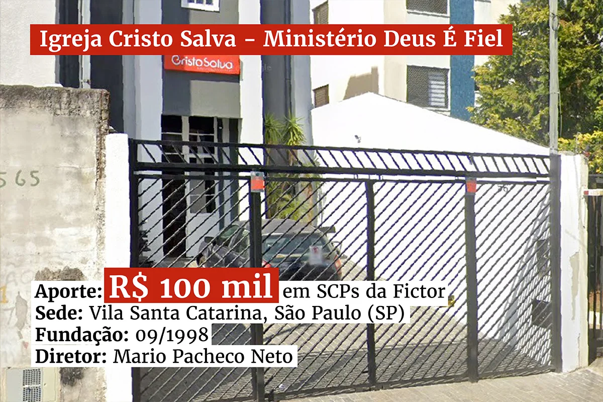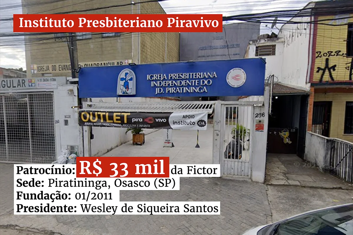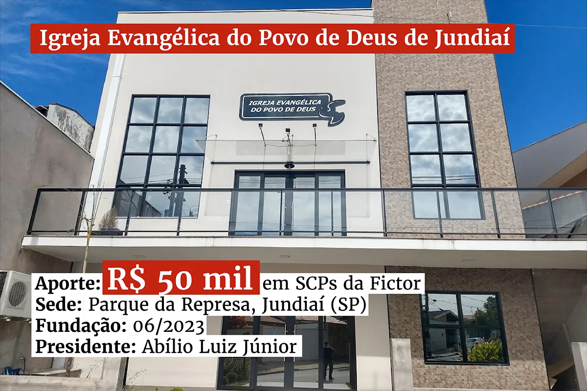 Também constam na lista a Igreja Cristo Salva – Ministério Deus É Fiel, com R$ 100 mil investidos, e a Igreja Evangélica do Povo de Deus, de Jundiaí, com R$ 50 mil. A ONG Celebrando a Recuperação Br aplicou R$ 95 mil em contratos do grupo, enquanto o Instituto Presbiteriano Piravivo aparece como credor por patrocínio de R$ 33 mil.