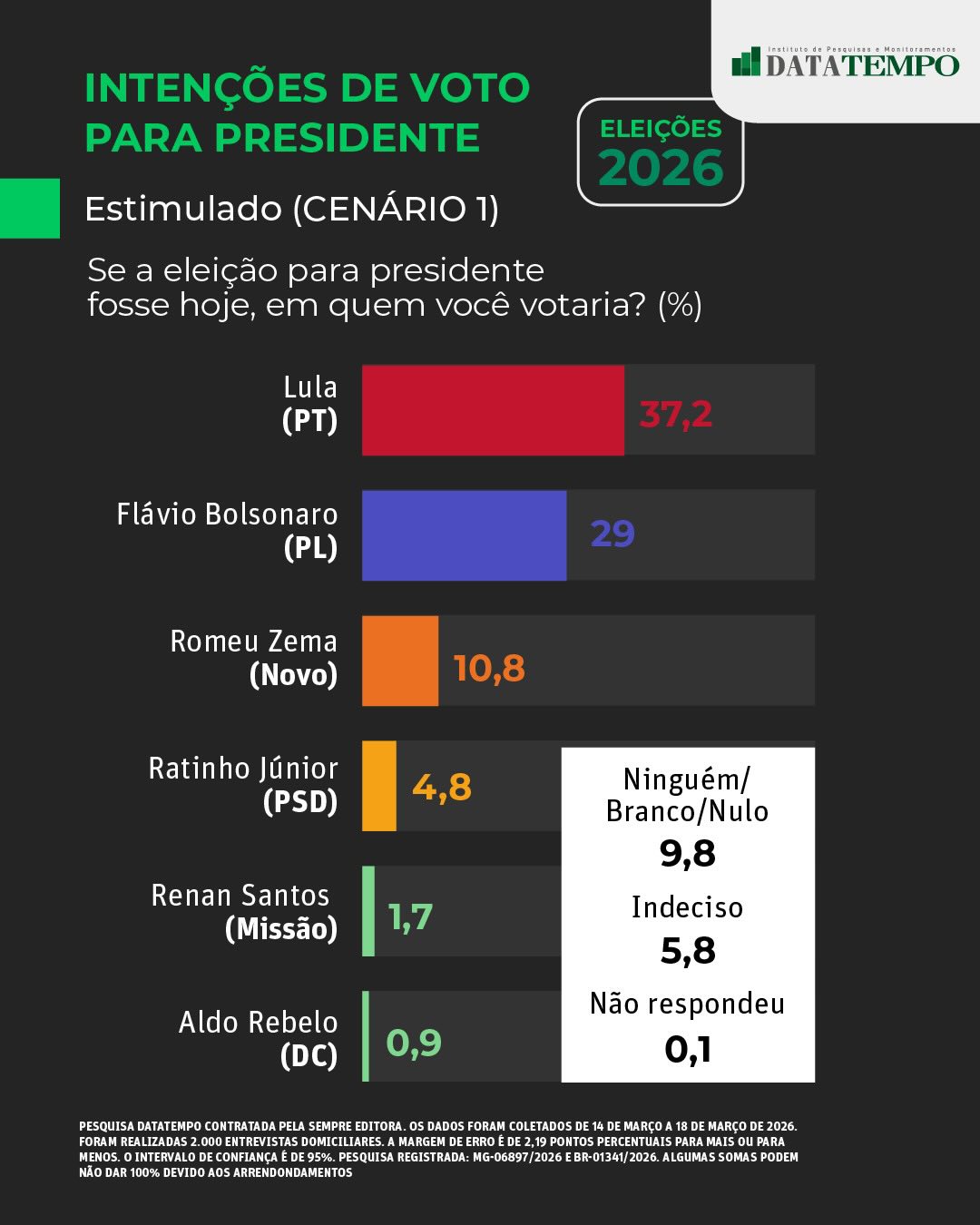 No cenário estimulado com maior vantagem, Lula aparece com 37,2% das intenções de voto, seguido por Flávio Bolsonaro, com 29%. Romeu Zema (Novo) surge em terceiro lugar, com 10,8%, enquanto outros nomes testados registram percentuais menores. Em diferentes recortes, Lula mantém variação entre 35,5% e 36,9%, sempre à frente dos adversários.