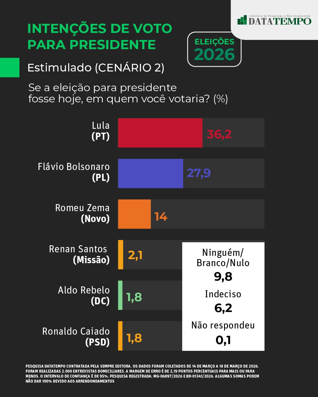 A pesquisa também testou outros cenários com nomes como Eduardo Leite (PSD), Ronaldo Caiado (PSD), Renan Santos (Missão) e Aldo Rebelo (DC). Em todos, Lula permaneceu na primeira posição, com Flávio Bolsonaro na vice-liderança e Zema consolidado como terceiro colocado.