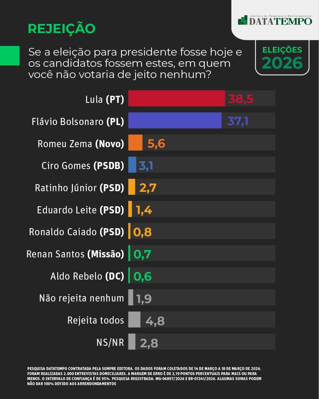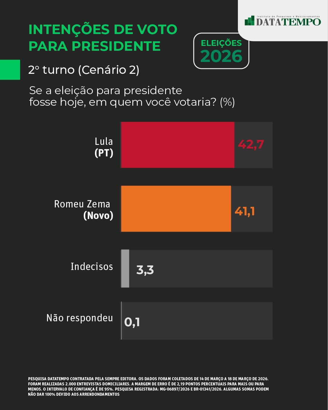 Em simulações de segundo turno, Lula também lidera numericamente. Contra Flávio Bolsonaro, o petista aparece com 45,7% dos votos, frente a 38,6% do senador. Já em um eventual confronto com Romeu Zema, há empate dentro da margem de erro, com 42,7% para Lula e 41,1% para o ex-governador.