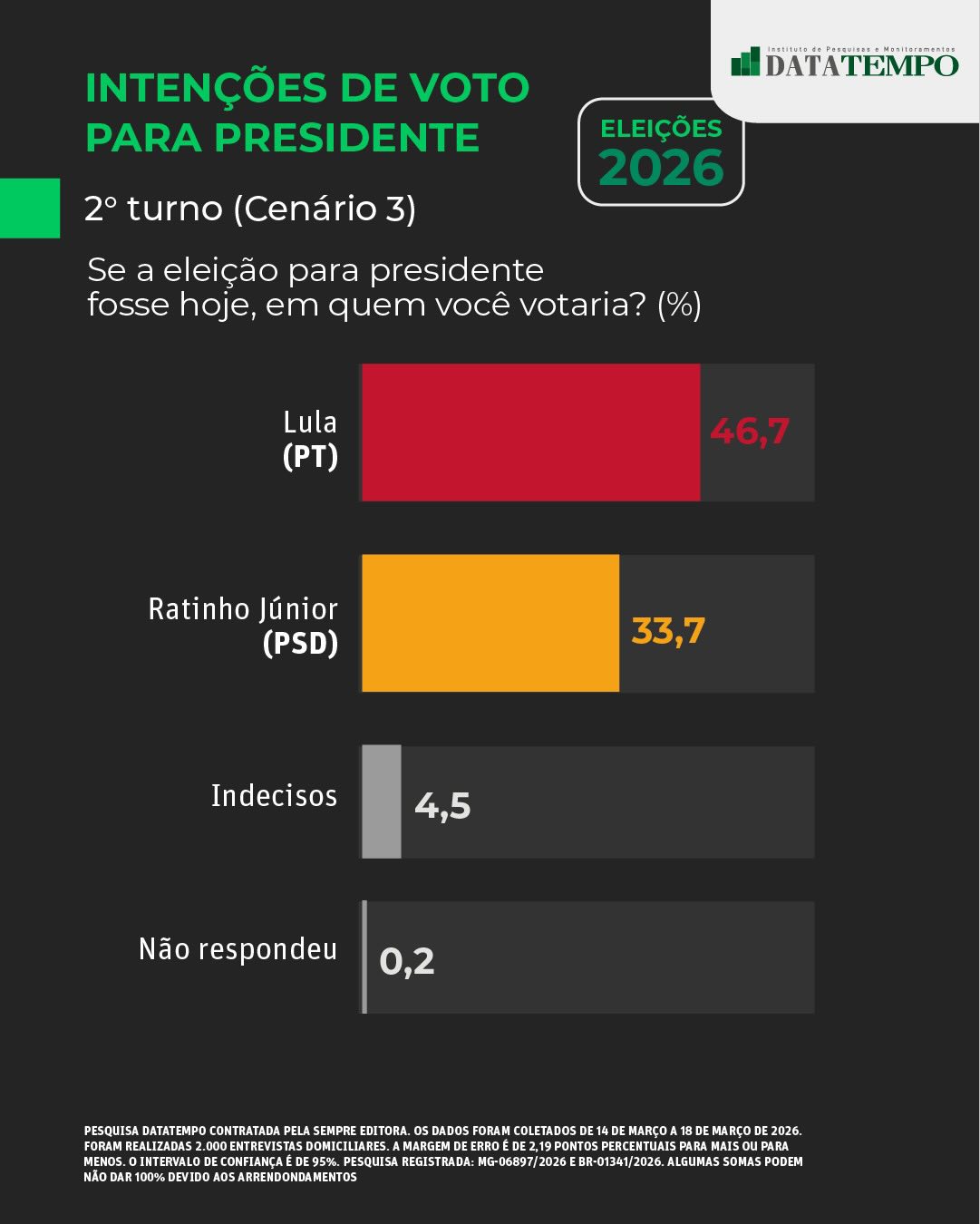 A pesquisa foi realizada entre os dias 14 e 18 de março, com 2.000 entrevistas domiciliares. A margem de erro é de 2,19 pontos percentuais, com nível de confiança de 95%. O levantamento está registrado sob os números MG-06897/2026 e BR-01341/2026.[