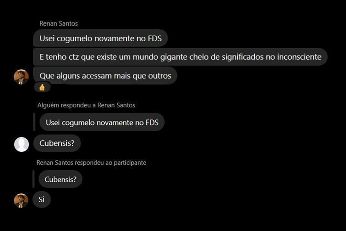Uma das principais contradições apontadas envolve a pauta antidrogas, que está no centro do discurso público do dirigente. No grupo Cannipapo, do qual participou entre 2024 e 2025, Renan relatou ter consumido cogumelos alucinógenos em mais de uma ocasião.