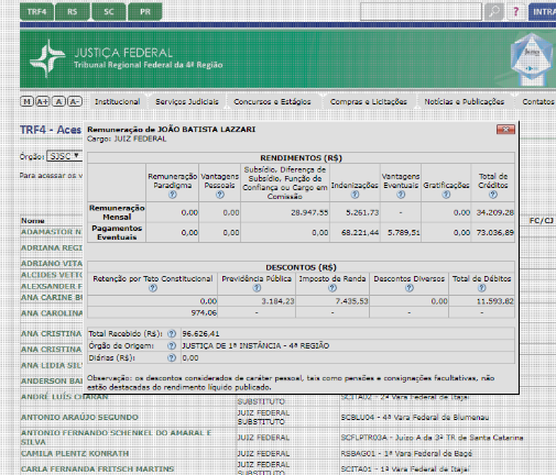 Santa Catarina não ficou por menos. O juiz federal João Batista Lazzari recebeu R$ 96.626,41, com “indenização” de R$ 68.221,44. Como eles, outros, pelo menos, 50 colegas do Tribunal Regional Federal da 4ª Região, que compreende os três estados do Sul, ganharam no mês passado mais do que o previsto pelo teto constitucional.