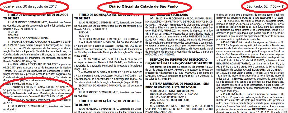 O prefeito de São Paulo João Doria Jr. nomeou para chefe de assessoria técnica da secretaria do governo o ex-prefeito de Cotia Antônio Carlos de Camargo, do PSDB.