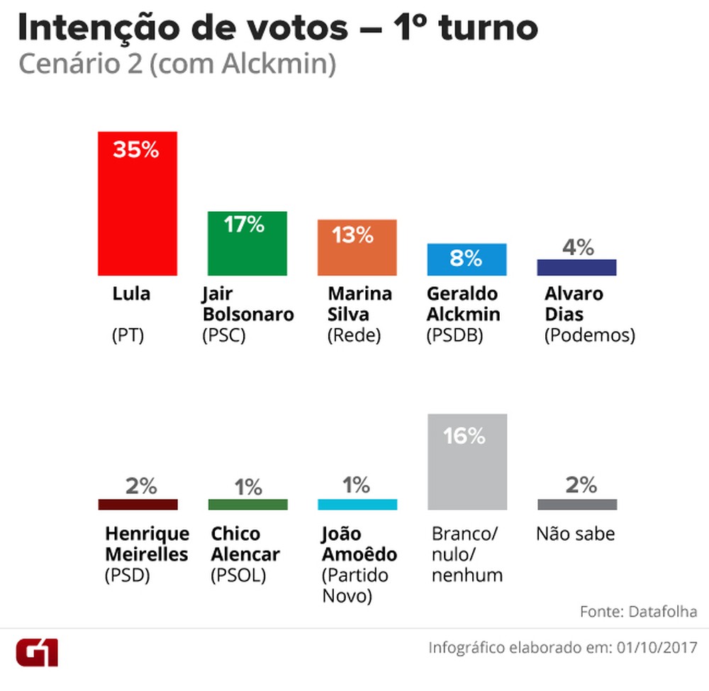 Bolsonaro e Marina aparecem empatados com 16% e 13%, respectivamente. Doria e Alckmn têm 8%.