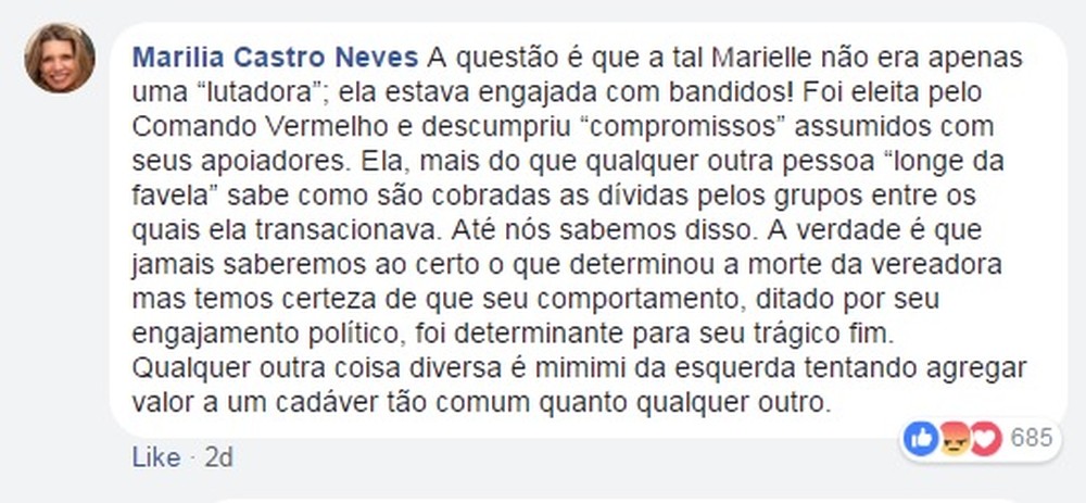 No Facebook, ela cravou que Marielle “foi eleita pelo Comando Vermelho”, entre outras barbaridades.