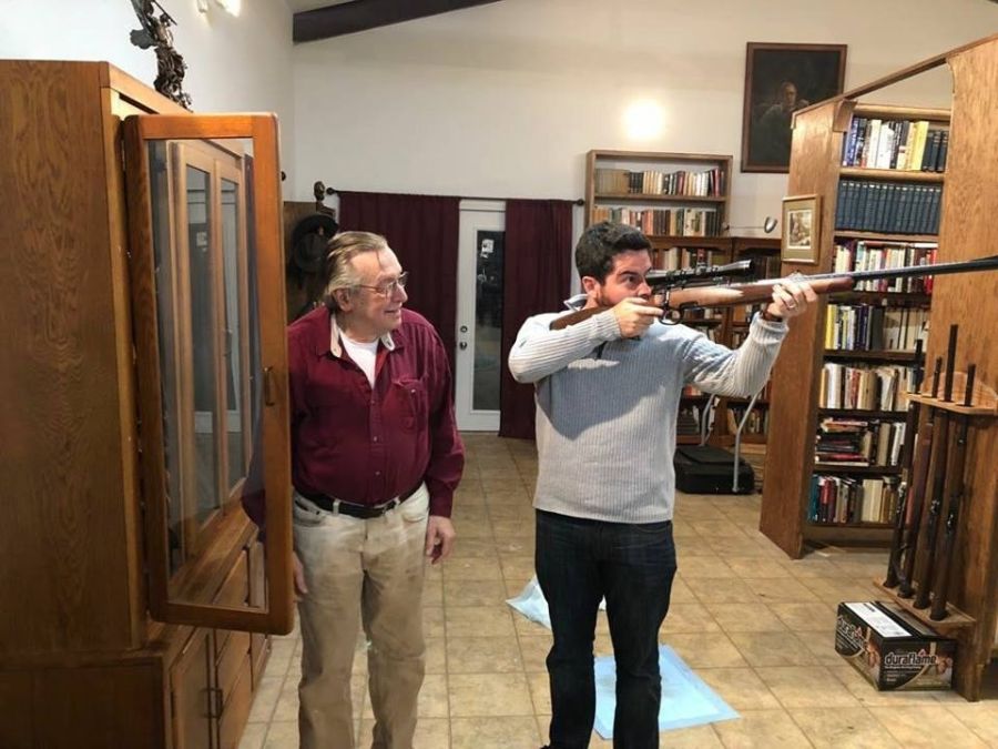 O pacote completo: além de Trump, adora Bolsonaro, Olavo de Carvalho e, por último mas não menos importante, armas. Versículos da Bíblia enfeitam a coisa.