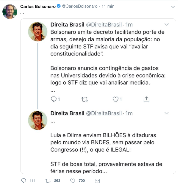 Segundo o perfil Direita Brasil, da linha de frente das milícias virtuais, o Supremo tem uma postura vigilante com medidas do governo Bolsonaro e é conivente com os “bilhões” enviados por Lula e Dilma “a ditaduras pelo mundo via BNDES”.