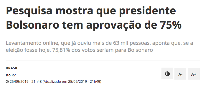 “Realizada pela internet”, diz a pilantragem, ela “mostra que o presidente Jair Bolsonaro tem índice de aprovação de 75% junto ao eleitorado brasileiro”.