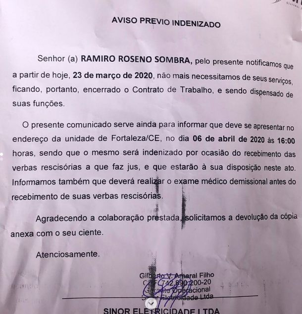 O eletricista Ramiro Sombra, de 28 anos, contou no Instagram que foi demitido nesta segunda-feira (23) pela empresa Sirtec, que presta serviços para a Enel, concessionária responsável pela distribuição de energia no Ceará.