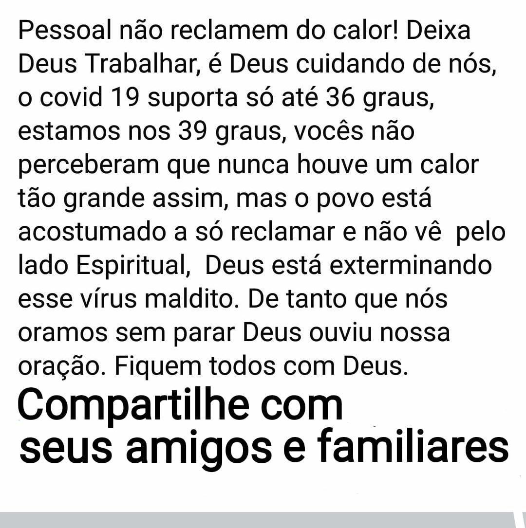 No WhatsApp, bolsonaristas mandam não reclamar do calor, pois é “Deus trabalhando para matar o vírus maldito” 8 de outubro de 2020 By Kiko Nogueira A mensagem abaixo está circulando em grupos bolsonaristas de WhatsApp. É a mamadeira de piroca versão sauna do Senhor.