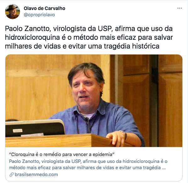Zanotto, bem como a ampla maioria dos presentes àquele encontro, é seguidor de Olavo. Em abril do ano passado, deu entrevista ao site do guru de extrema direita cravando que “cloroquina é o remédio para vencer a epidemia”.